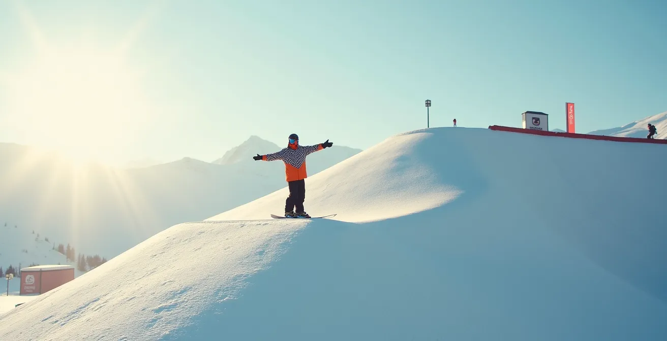 La deuxième raison est la qualité de la neige. Tôt le matin, le park peut être gelé (« béton »), rendant les réceptions impitoyables et les carres peu fiables. En fin de journée, la neige devient souvent lourde et collante (« soupe »), ce qui ralentit la prise d’élan et rend les rotations plus difficiles. Entre 11h et 14h, la neige a généralement eu le temps de « décailler » sous l’effet du soleil. Elle devient plus souple, plus tolérante, pardonnant les petites erreurs de réception sans pour autant freiner la glisse. C’est la neige parfaite pour apprendre : elle offre un bon compromis entre grip et amorti.
